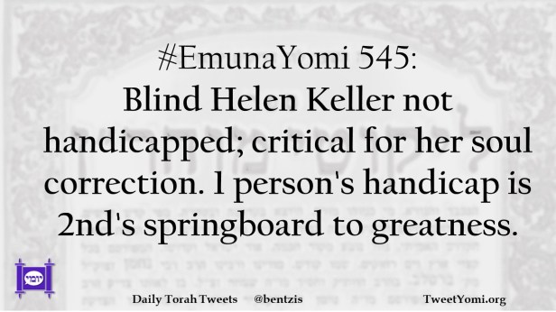 #EmunaYomi 545: Blind Helen Keller not handicapped; critical for her soul correction. 1 person’s handicap is 2nd’s springboard to greatness.