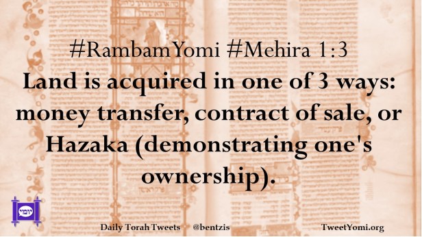#RambamYomi #Mehira 1:3 Land is acquired in one of 3 ways: money transfer, contract of sale, or Hazaka (demonstrating one’s ownership).