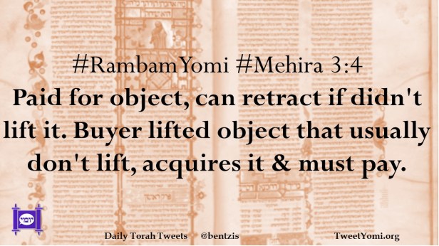 #RambamYomi #Mehira 3:4 Paid for object, can retract if didn’t lift it. Buyer lifted object that usually don’t lift, acquires it & must pay.