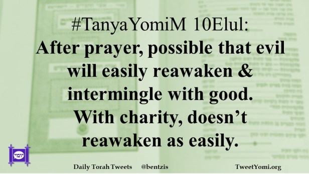 #TanyaYomiM 10Elul: After prayer, possible that evil will easily reawaken & intermingle with good. With charity, doesn’t reawaken as easily.