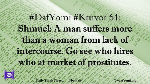 DafYomi, Ktuvot #DafYomi #Ktuvot 64 Date: September 20, 2022Author: ysspitz #DafYomi #Ktuvot 64: Shmuel: A man suffers more than a woman from lack of intercourse. Go see who hires who at market of prostitutes. Share this: Share on X (Opens in new window) X Share on Facebook (Opens in new window) Facebook Like Loading... Related