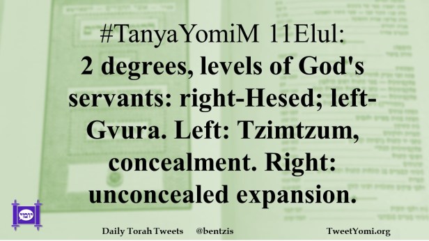 #TanyaYomiM 11Elul: 2 degrees, levels of God’s servants: right-Hesed; left-Gvura. Left: Tzimtzum, concealment. Right: unconcealed expansion.
