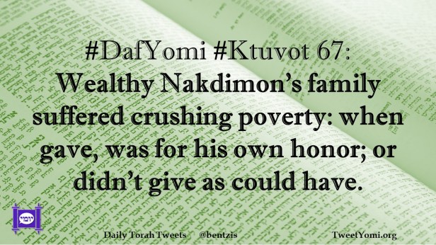 DafYomi, Ktuvot #DafYomi #Ktuvot 67 Date: September 21, 2022Author: ysspitz #DafYomi #Ktuvot 67: Wealthy Nakdimon’s family suffered crushing poverty: when gave, was for his own honor; or didn’t give as could have. Share this: Share on X (Opens in new window) X Share on Facebook (Opens in new window) Facebook Like Loading... Related