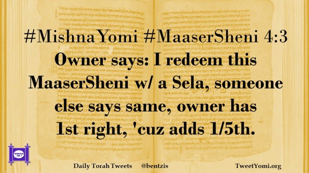#MishnaYomi #MaaserSheni 4:3 Owner says: I redeem this MaaserSheni w/ a Sela, someone else says same, owner has 1st right, ‘cuz adds 1/5th.