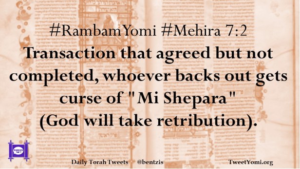 #RambamYomi #Mehira 7:2 Transaction that agreed but not completed, whoever backs out gets curse of “Mi Shepara” (God will take retribution).