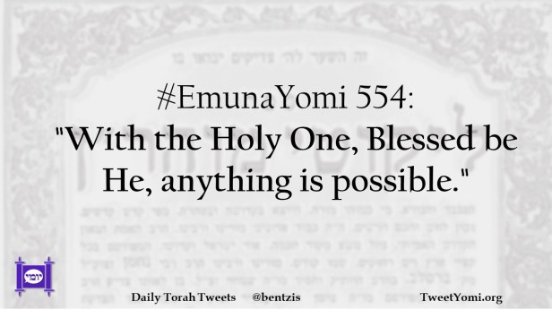EmunaYomi #EmunaYomi 554 Date: September 22, 2022Author: ysspitz #EmunaYomi 554: “With the Holy One, Blessed be He, anything is possible.” Share this: Share on X (Opens in new window) X Share on Facebook (Opens in new window) Facebook Like Loading... Related