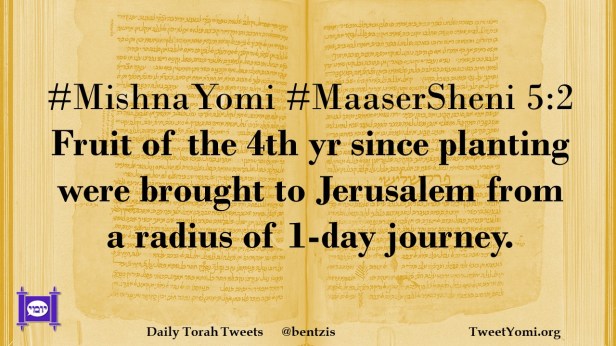 MaaserSheni, MishnaYomi #MishnaYomi #MaaserSheni 5:2 Date: September 22, 2022Author: ysspitz #MishnaYomi #MaaserSheni 5:2 Fruit of the 4th yr since planting were brought to Jerusalem from a radius of 1-day journey. Share this: Share on X (Opens in new window) X Share on Facebook (Opens in new window) Facebook Like Loading... Related