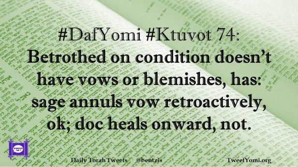DafYomi, Ktuvot #DafYomi #Ktuvot 74 Date: October 3, 2022Author: ysspitz #DafYomi #Ktuvot 74: Betrothed on condition doesn’t have vows or blemishes, has: sage annuls vow retroactively, ok; doc heals onward, not. Share this: Share on X (Opens in new window) X Share on Facebook (Opens in new window) Facebook Like Loading... Related