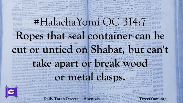 #HalachaYomi OC 314:7 Ropes that seal container can be cut or untied on Shabat, but can’t take apart or break wood or metal clasps.