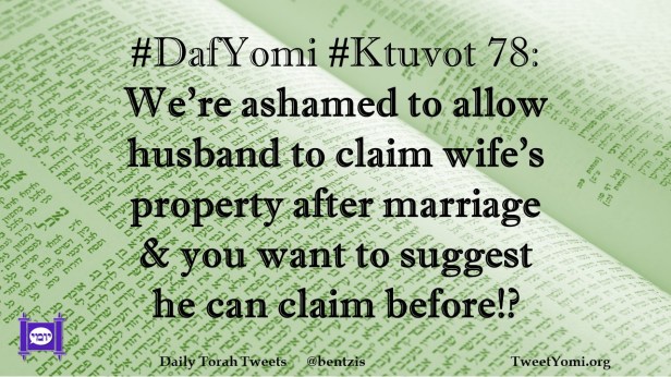 DafYomi, Ktuvot #DafYomi #Ktuvot 78 Date: October 6, 2022Author: ysspitz #DafYomi #Ktuvot 78: We’re ashamed to allow husband to claim wife’s property after marriage & you want to suggest he can claim before!? Share this: Share on X (Opens in new window) X Share on Facebook (Opens in new window) Facebook Like Loading... Related