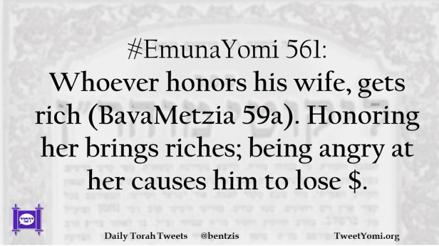#EmunaYomi 561: Whoever honors his wife, gets rich (BavaMetzia 59a). Honoring her brings riches; being angry at her causes him to lose $.