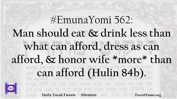 #EmunaYomi 562: Man should eat & drink less than what can afford, dress as can afford, & honor wife *more* than can afford (Hulin 84b).