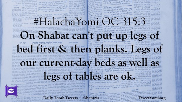#HalachaYomi OC 315:3 On Shabat can’t put up legs of bed first & then planks. Legs of our current-day beds as well as legs of tables are ok.