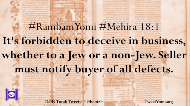 #RambamYomi #Mehira 18:1 It’s forbidden to deceive in business, whether to a Jew or a non-Jew. Seller must notify buyer of all defects.