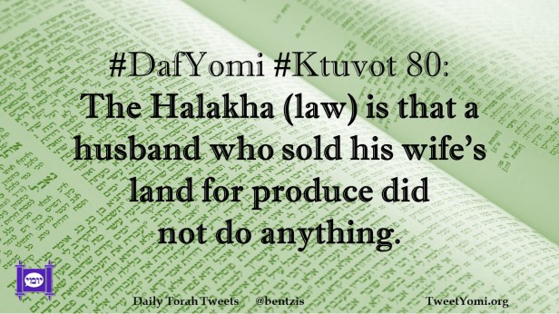 DafYomi, Ktuvot #DafYomi #Ktuvot 80 Date: October 7, 2022Author: ysspitz #DafYomi #Ktuvot 80: The Halakha (law) is that a husband who sold his wife’s land for produce did not do anything. Share this: Share on X (Opens in new window) X Share on Facebook (Opens in new window) Facebook Like Loading... Related