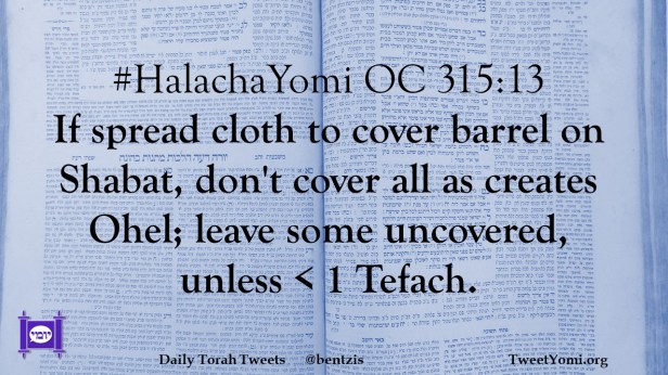 #HalachaYomi OC 315:13: If spread cloth to cover barrel on Shabat, don’t cover all as creates Ohel; leave some uncovered, unless < 1 Tefach.