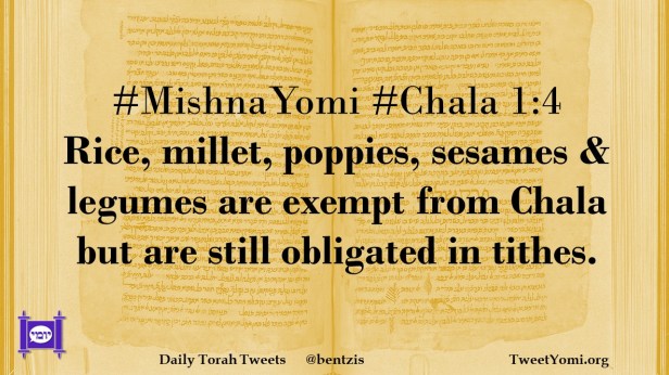 Chala, MishnaYomi #MishnaYomi #Chala 1:4 Date: October 7, 2022Author: ysspitz #MishnaYomi #Chala 1:4 Rice, millet, poppies, sesames & legumes are exempt from Chala but are still obligated in tithes. Share this: Share on X (Opens in new window) X Share on Facebook (Opens in new window) Facebook Like Loading... Related