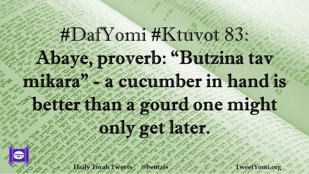 DafYomi, Ktuvot #DafYomi #Ktuvot 83 Date: October 11, 2022Author: ysspitz #DafYomi #Ktuvot 83: Abaye, proverb: “Butzina tav mikara” – a cucumber in hand is better than a gourd one might only get later. Share this: Share on X (Opens in new window) X Share on Facebook (Opens in new window) Facebook Like Loading... Related