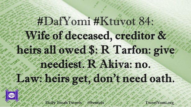 DafYomi, Ktuvot #DafYomi #Ktuvot 84 Date: October 11, 2022Author: ysspitz #DafYomi #Ktuvot 84: Wife of deceased, creditor & heirs all owed $: R Tarfon: give neediest. R Akiva: no. Law: heirs get, don’t need oath. Share this: Share on X (Opens in new window) X Share on Facebook (Opens in new window) Facebook Like Loading... Related