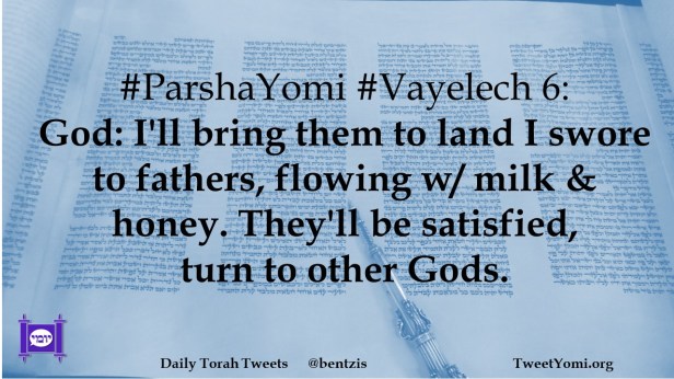 #ParshaYomi #Vayelech 6: God: I’ll bring them to land I swore to fathers, flowing w/ milk & honey. They’ll be satisfied, turn to other Gods.