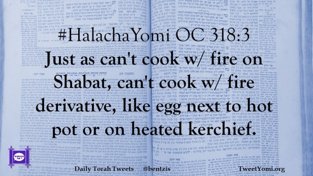 #HalachaYomi OC 318:3 Just as can’t cook w/ fire on Shabat, can’t cook w/ fire derivative, like egg next to hot pot or on heated kerchief.