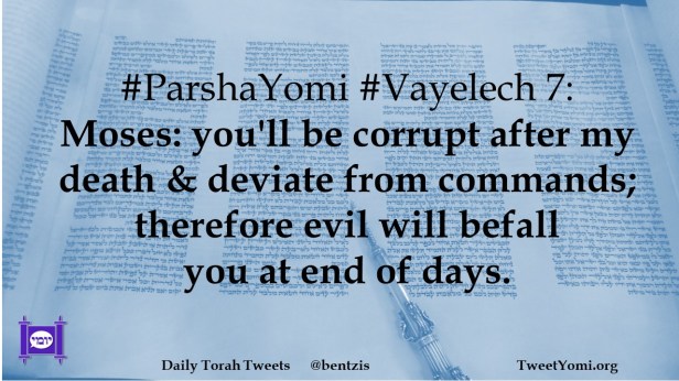 #ParshaYomi #Vayelech 7: Moses: you’ll be corrupt after my death & deviate from commands; therefore evil will befall you at end of days.