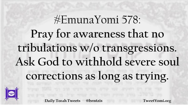 #EmunaYomi 578: Pray for awareness that no tribulations w/o transgressions. Ask God to withhold severe soul corrections as long as trying.