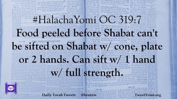 #HalachaYomi OC 319:7 Food peeled before Shabat can’t be sifted on Shabat w/ cone, plate or 2 hands. Can sift w/ 1 hand w/ full strength.