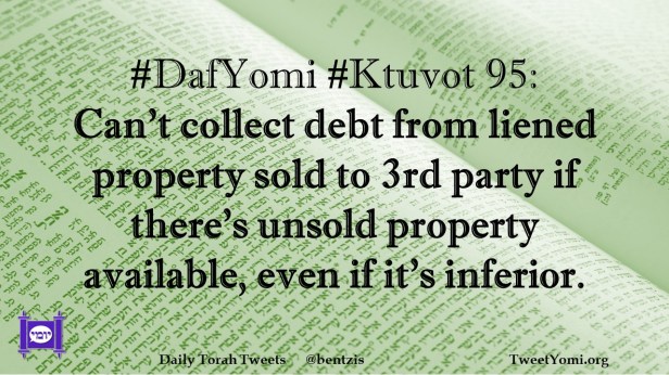 DafYomi, Ktuvot #DafYomi #Ktuvot 95 Date: February 7, 2023Author: netanelspitz #DafYomi #Ktuvot 95: Can’t collect debt from liened property sold to 3rd party if there’s unsold property available, even if it’s inferior. Share this: Share on X (Opens in new window) X Share on Facebook (Opens in new window) Facebook Like Loading... Related