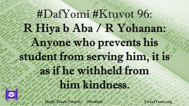 DafYomi, Ktuvot #DafYomi #Ktuvot 96 Date: February 7, 2023Author: netanelspitz #DafYomi #Ktuvot 96: R Hiya b Aba / R Yohanan: Anyone who prevents his student from serving him, it is as if he withheld from him kindness. Share this: Share on X (Opens in new window) X Share on Facebook (Opens in new window) Facebook Like Loading... Related