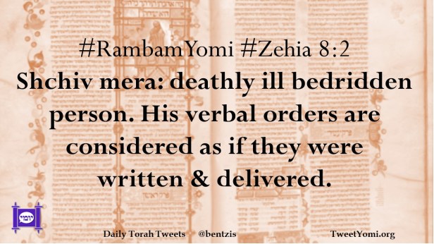 #RambamYomi #Zehia 8:2 Shchiv mera: deathly ill bedridden person. His verbal orders are considered as if they were written & delivered.