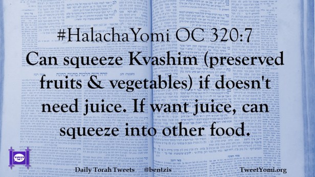 #HalachaYomi OC 320:7 Can squeeze Kvashim (preserved fruits & vegetables) if doesn’t need juice. If want juice, can squeeze into other food.