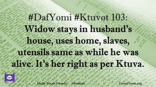 DafYomi, Ktuvot #DafYomi #Ktuvot 103 Date: February 9, 2023Author: netanelspitz #DafYomi #Ktuvot 103: Widow stays in husband’s house, uses home, slaves, utensils same as while he was alive. It’s her right as per Ktuva. Share this: Share on X (Opens in new window) X Share on Facebook (Opens in new window) Facebook Like Loading... Related