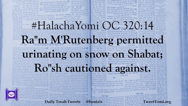 HalachaYomi #HalachaYomi OC 320:14 Date: February 9, 2023Author: netanelspitz #HalachaYomi OC 320:14 Ra”m M’Rutenberg permitted urinating on snow on Shabat; Ro”sh cautioned against. Share this: Share on X (Opens in new window) X Share on Facebook (Opens in new window) Facebook Like Loading... Related
