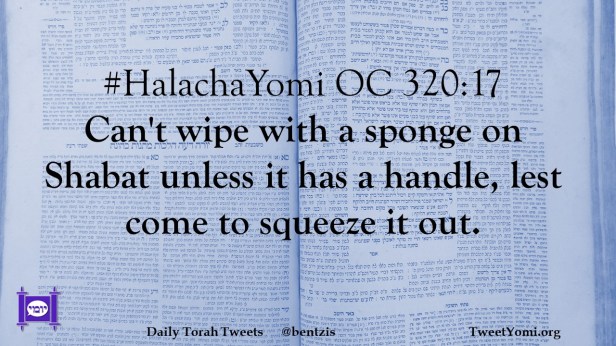 HalachaYomi #HalachaYomi OC 320:17 Date: February 9, 2023Author: netanelspitz #HalachaYomi OC 320:17 Can’t wipe with a sponge on Shabat unless it has a handle, lest come to squeeze it out. Share this: Share on X (Opens in new window) X Share on Facebook (Opens in new window) Facebook Like Loading... Related