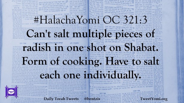 #HalachaYomi OC 321:3 Can’t salt multiple pieces of radish in one shot on Shabat. Form of cooking. Have to salt each one individually.