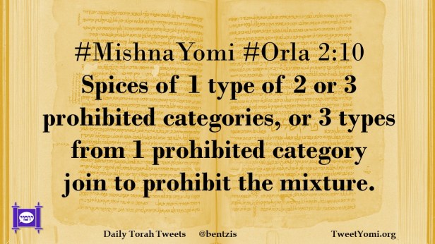 #MishnaYomi #Orla 2:10 Spices of 1 type of 2 or 3 prohibited categories, or 3 types from 1 prohibited category join to prohibit the mixture.