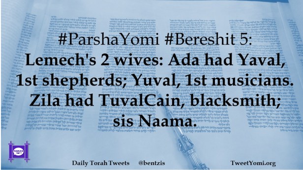 #ParshaYomi #Bereshit 5: Lemech’s 2 wives: Ada had Yaval, 1st shepherds; Yuval, 1st musicians. Zila had TuvalCain, blacksmith; sis Naama.