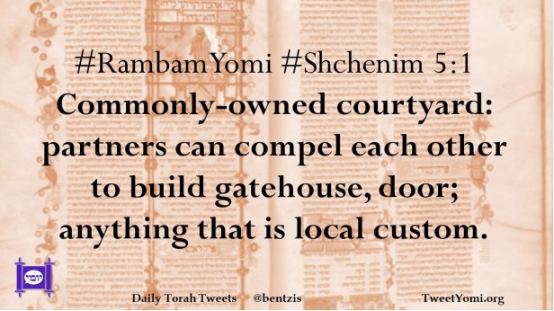 #RambamYomi #Shchenim 5:1 Commonly-owned courtyard: partners can compel each other to build gatehouse, door; anything that is local custom.