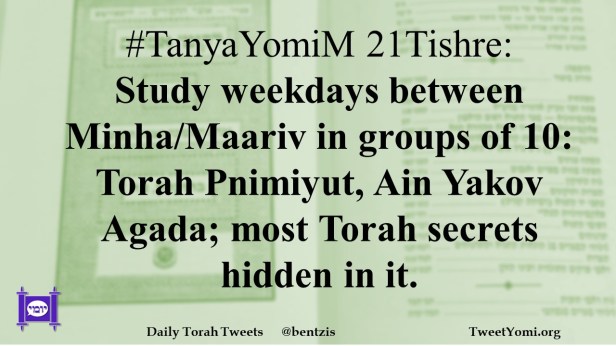 #TanyaYomiM 21Tishre: Study weekdays between Minha/Maariv in groups of 10: Torah Pnimiyut, Ain Yakov Agada; most Torah secrets hidden in it.