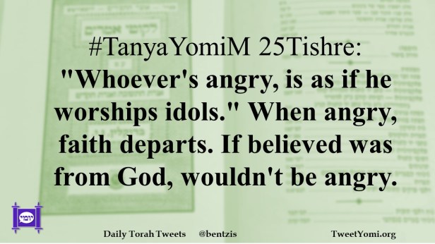 #TanyaYomiM 25Tishre: “Whoever’s angry, is as if he worships idols.” When angry, faith departs. If believed was from God, wouldn’t be angry.