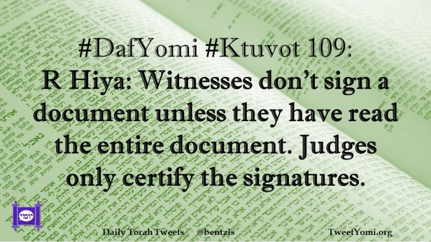 DafYomi, Ktuvot #DafYomi #Ktuvot 109 Date: February 13, 2023Author: netanelspitz #DafYomi #Ktuvot 109: R Hiya: Witnesses don’t sign a document unless they have read the entire document. Judges only certify the signatures. Share this: Share on X (Opens in new window) X Share on Facebook (Opens in new window) Facebook Like Loading... Related