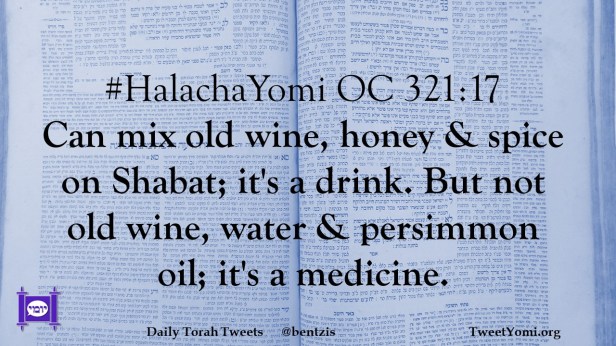 #HalachaYomi OC 321:17 Can mix old wine, honey & spice on Shabat; it’s a drink. But not old wine, water & persimmon oil; it’s a medicine.