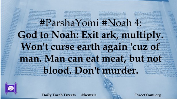 #ParshaYomi #Noah 4: God to Noah: Exit ark, multiply. Won’t curse earth again ‘cuz of man. Man can eat meat, but not blood. Don’t murder.