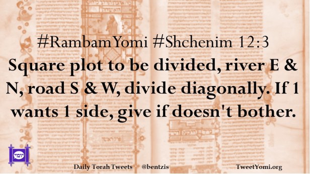 #RambamYomi #Shchenim 12:3 Square plot to be divided, river E & N, road S & W, divide diagonally. If 1 wants 1 side, give if doesn’t bother.
