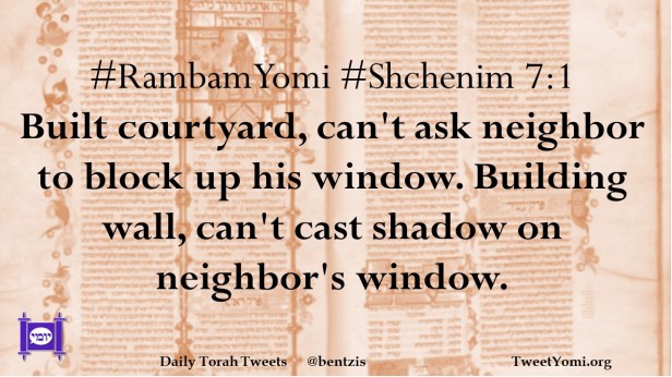 #RambamYomi #Shchenim 7:1 Built courtyard, can’t ask neighbor to block up his window. Building wall, can’t cast shadow on neighbor’s window.