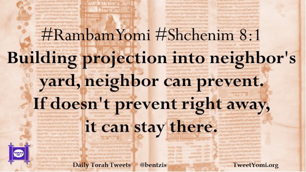 #RambamYomi #Shchenim 8:1 Building projection into neighbor’s yard, neighbor can prevent. If doesn’t prevent right away, it can stay there.
