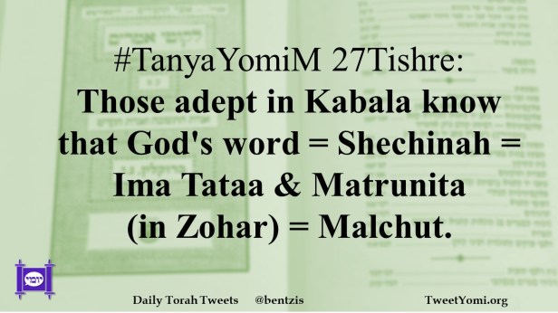 TanyaYomiM #TanyaYomiM 27Tishre Date: February 13, 2023Author: netanelspitz #TanyaYomiM 27Tishre: Those adept in Kabala know that God’s word = Shechinah = Ima Tataa & Matrunita (in Zohar) = Malchut. Share this: Share on X (Opens in new window) X Share on Facebook (Opens in new window) Facebook Like Loading... Related
