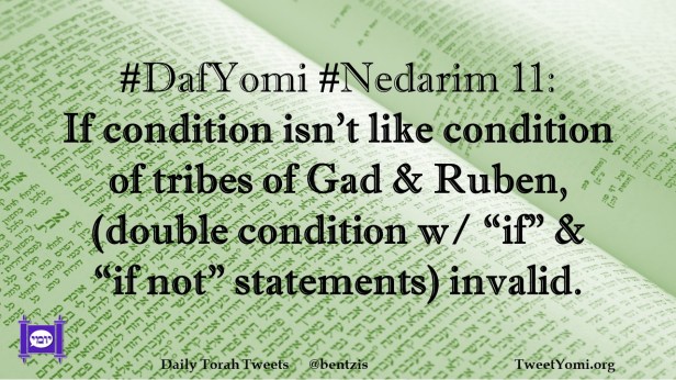 DafYomi, Nedarim #DafYomi #Nedarim 11 Date: February 14, 2023Author: netanelspitz #DafYomi #Nedarim 11: If condition isn’t like condition of tribes of Gad & Ruben, (double condition w/ “if” & “if not” statements) invalid. Share this: Share on X (Opens in new window) X Share on Facebook (Opens in new window) Facebook Like Loading... Related