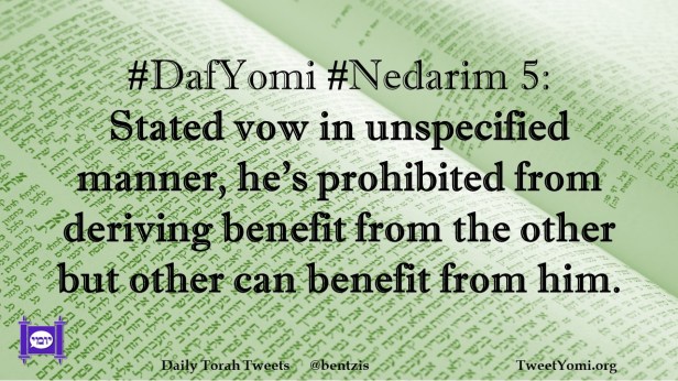 DafYomi, Nedarim #DafYomi #Nedarim 5 Date: February 14, 2023Author: netanelspitz #DafYomi #Nedarim 5: Stated vow in unspecified manner, he’s prohibited from deriving benefit from the other but other can benefit from him. Share this: Share on X (Opens in new window) X Share on Facebook (Opens in new window) Facebook Like Loading... Related